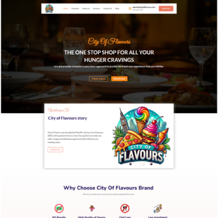 A vibrant, food-centric website designed for City of Flavours, showcasing their multi-cuisine offerings, inviting restaurant atmosphere, and easy-to-navigate menu sections. The site reflects the brand’s identity with mouth-watering visuals and provides essential details like location, timings, and online reservations.